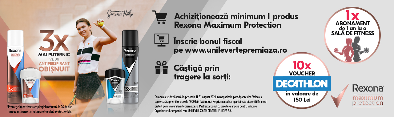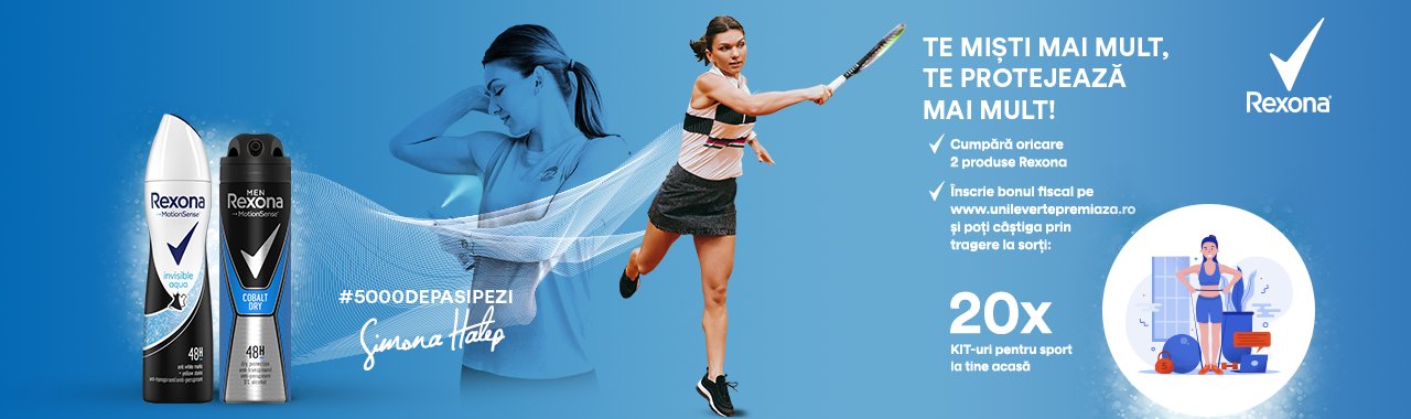 Rexona, cu susținerea Simonei Halep, lansează provocarea celor 5000 de pasi pe zi. Bucură-te de efectele benefice pe care un stil de viață activ le are asupra corpului, minții și stării de spirit. Deodorantul antiperspirant Rexona este disponibil în formatele spray, stick și roll-on. Profită de protecția eficientă împotriva transpirației activată cu fiecare mișcare de tehnologia Motion Sense și bucură-te de prospețime întreaga zi.