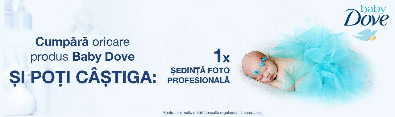 Cumpără oricare două produse Baby Dove, pe același bon fiscal din farmaciile participante Catena, înscrie-te pe www.unilevertepremiaza.ro şi poţi câştiga prin tragere la sorţi o ședință foto profesională pentru bebeluși.