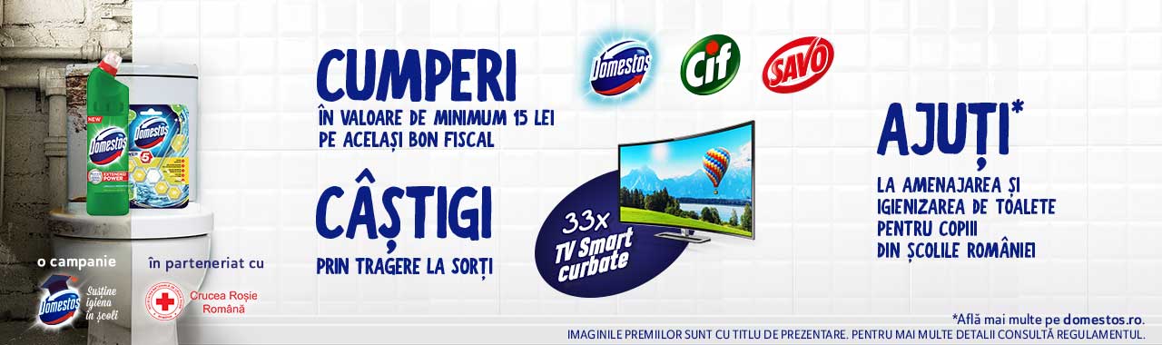 Cumpără oricare produse Domestos, CIF sau Savo în valoare de minimum 15 Lei pe acelaşi bon fiscal înscrie bonul fiscal pe www.unilevertepremiaza.ro şi ai şansa de a câştiga unul dintre cele 33 x TV-uri Smart cu ecran curbat!