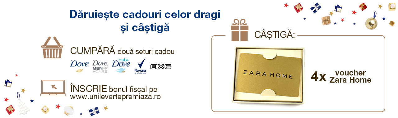 Cumpără două seturi cadou Dove, Dove Baby, Dove Men+Care, Axe sau Rexona din magazinele Cora, pe acelaşi bon fiscal înscrie bonul fiscal pe www.unilevertepremiaza.ro şi ai şansa de a câştiga un voucher cadou Zara Home în valoare de 400 de lei!