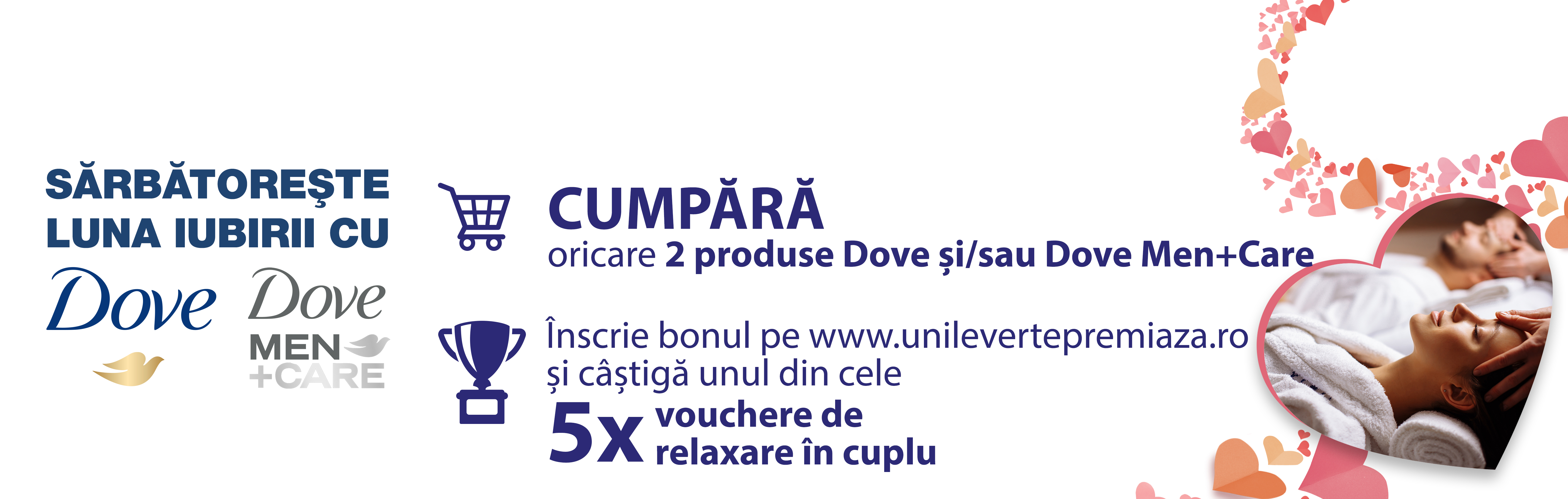 Achiziționează oricare 2 produse Dove și/sau Dove Men +Care pe același bon fiscal din magazinele Cora şi poţi câştiga la finalul campaniei unul dintre premiile oferite prin tragere la sorți: 5x vouchere de de masaj pentru tine și jumătatea ta!