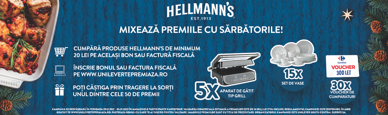 Cumpără, în perioada 9 decembrie 2021 - 5 ianuarie 2022, produse Hellmann's de minimum 20 lei pe același bon sau factură fiscală, din magazinele Carrefour participante. Înscrie bonul pe www.unilevertepremiaza.ro și poți câștiga prin tragere la sorți unul dintre premiile: