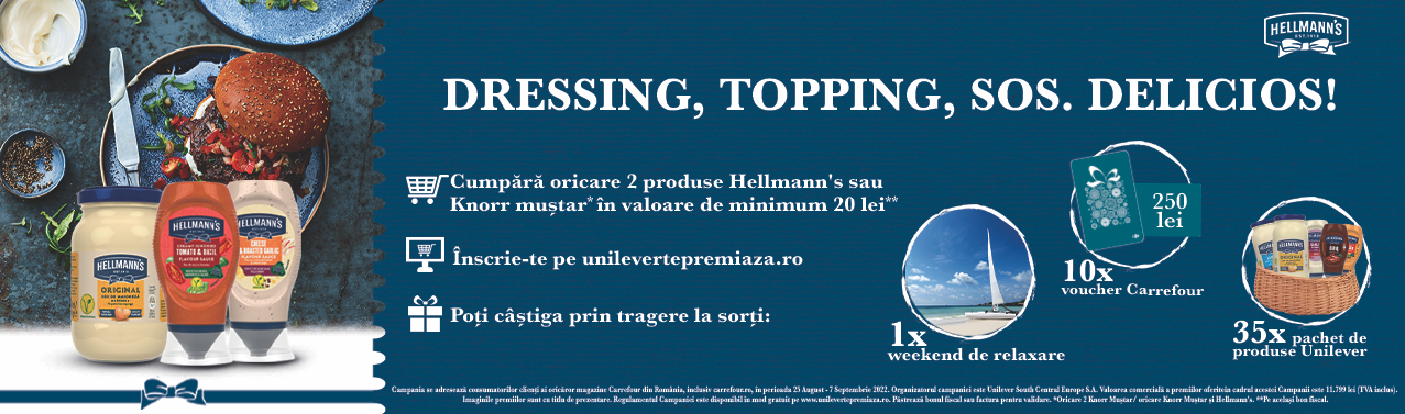 Mecanism: Cumpără oricare 2 produse Hellmann’s sau Knorr muștar* în valoare de minimum 20 lei pe același bon fiscal, înscrie bonul fiscal pe site și poți câștiga prin tragere la sorți: