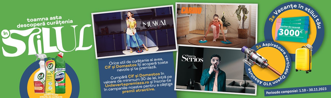 Cumpără în perioada 1.10 -30.11.2023 oricare Cif și Domestos în valoare de minimum 30 lei pe același bon fiscal, înscrie bonul fiscal pe unilevertepremiaza.ro și poți căștiga prin tragere la sorți unul din premiile de mai jos: