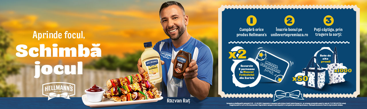În perioada 01.05 – 31.08.2025, achiziționează cel puțin un produs Hellmann’s, înscrie bonul în formularul de mai jos și poți câștiga prin tragere la sorți unul dintre premiile campaniei: