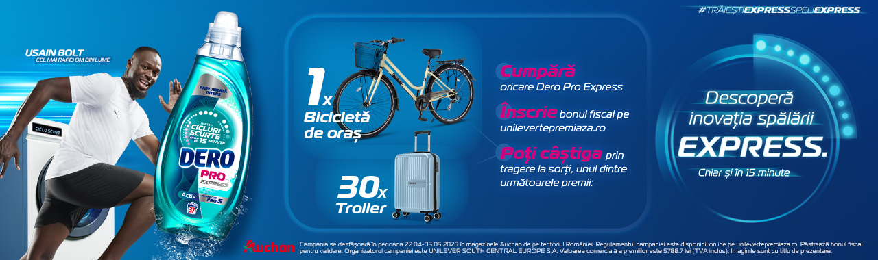 Cumpără oricare produs Dero Pro Express din magazinele Auchan hypermarket, înscrie bonul fiscal pe unilevertepremiaza.ro și poți câștiga, prin tragere la sorți, unul din următoarele premii: